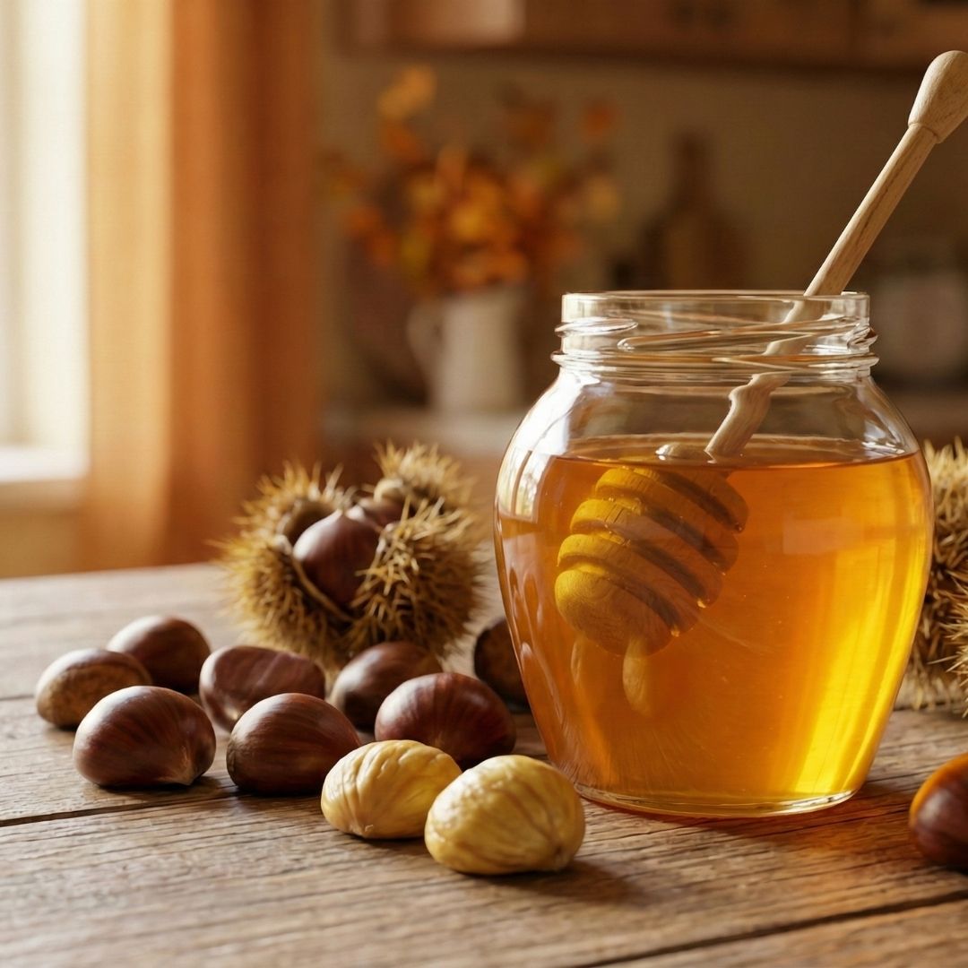 Wymieszaj 20g mąki z kasztanów jadalnych ze 100g płynnego miodu.